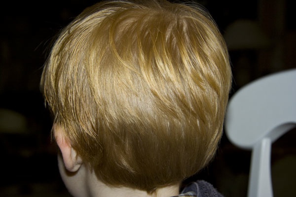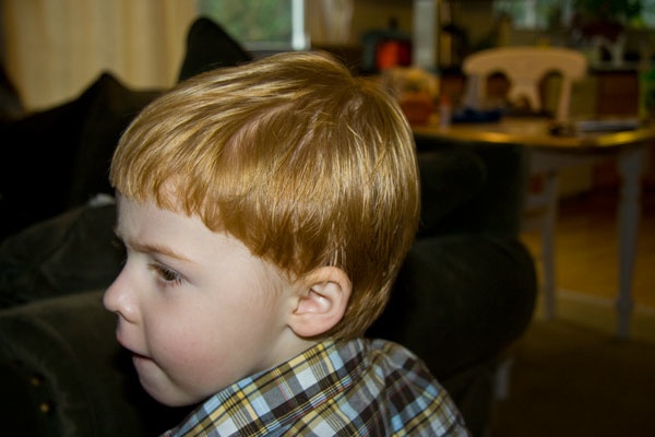 Yeah, a little George Clooney circa ER years, but hey, he’s three. And wiggles a lot, even while watching “The Emperor’s New Groove”, hence the slightly crooked bangs. And I wish he didn’t have ears…would make it a lot easier if I didn’t have to cut around those things.