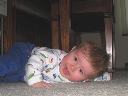 After my blood-letting, Cooper and I hung out with Mom’s little dog, Chaz, and ooh’d and aww’d at her marvelous kitchen. He also tried crawling, but only managed to commando-crawl backwards and get himself wedged in-between the piano and a microwave (um, my brother was in the process of moving…they don’t usually keep kitchen appliances next to musical instruments). And since I’m such a stellar mother, I made sure to take pictures: