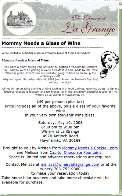 Man, I wish I could go to that! But in an effort to cut back on spending and prior family obligations, I will have to be drinking my wine here in MD. But how will I live without my own souvenir wine glass???