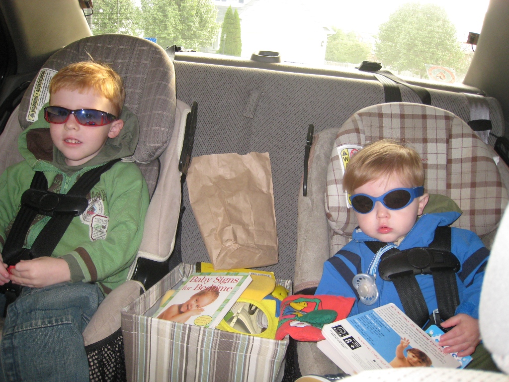 • Wanna hear about Cooper’s ears? You know you do! They’re actually doing great. He has been so incredibly happy all week, checking out all the sounds that he seemed to have been missing the past two-plus months. He has been repeating more and more of what I say and is responding better to what I say to him (i.e. “close the door”, “turn off the light”, “time for bubble-bath”), and has been singing in the car because he loves to say “la la la” with his tongue sticking far out of his mouth. It’s hilarious. Even better is that he has been laughing. Like throwing his head back and letting out these huge guffaws! And he loves doing it and tries to get Gavin to laugh with him (and Gavin is usually more than happy to laugh along with him, since he used to goad Cooper into laughing). The two of them just sitting there laughing in each other’s faces, watching Gavin let Cooper tackle him and squish him, and the picture below is what got me through this stressful week. Well, that and knowing Justin will be back Friday and will take over the kid-duty on Saturday morning, locking all lifeforms out of our room, letting me sleep until 9am in peace…whether he knows it or not.
