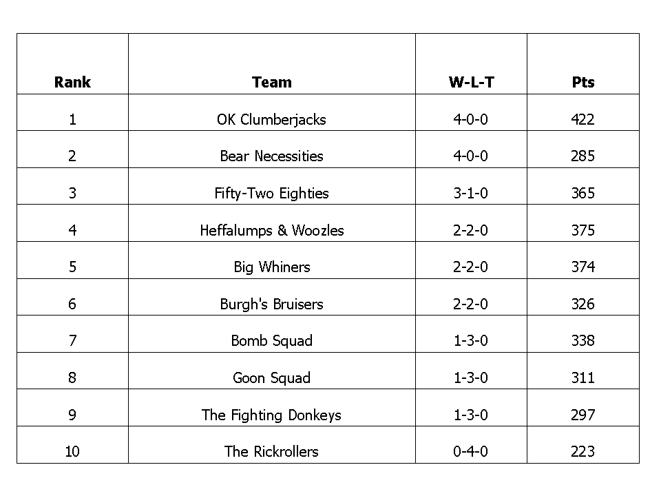Dude. I don’t know what happened, but somehow I got the highest point total this week (whoo-hoo! *does cabbage-patch, the sprinkler, and raises the roof*), but uh, Kim’s undefeated OK Clumberjacks are still beating the pants off of all of us. And Janet’s Bear Necessities are also running around undefeated. And due to Drew Brees, Larry Johnson, and Tennessee’s Defense, I have moved up to 5th place. Love them guys. Hope they stay healthy for me this weekend since I will be up against the Clumberjacks. No pressure…no pressure…find my happy place….